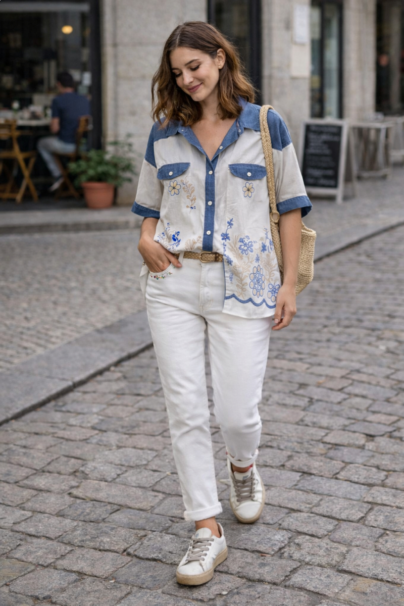 Camisa em tecido leve com combinação bicolor em azul e branco, enriquecida com bordado floral na parte inferior que acrescenta personalidade e um toque artesanal à peça. O modelo apresenta bolsos frontais, botões centrais e corte solto, ideal para usar fechada ou aberta como sobrecamisa. A barra com acabamento ondulado bordado dá um charme extra e diferencia-a das camisas clássicas.