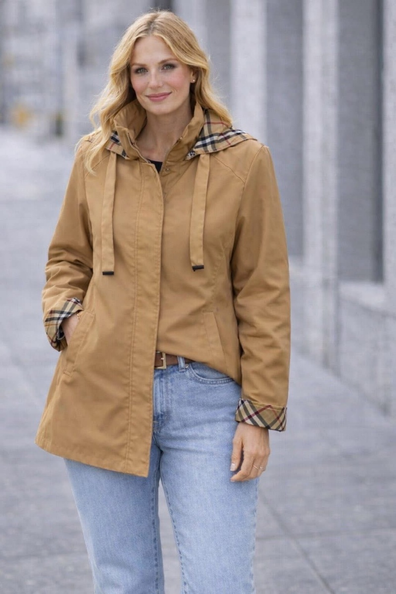 O grande destaque está no forro xadrez no interior do capuz e nos punhos — um detalhe elegante que faz toda a diferença quando arregaças a manga.