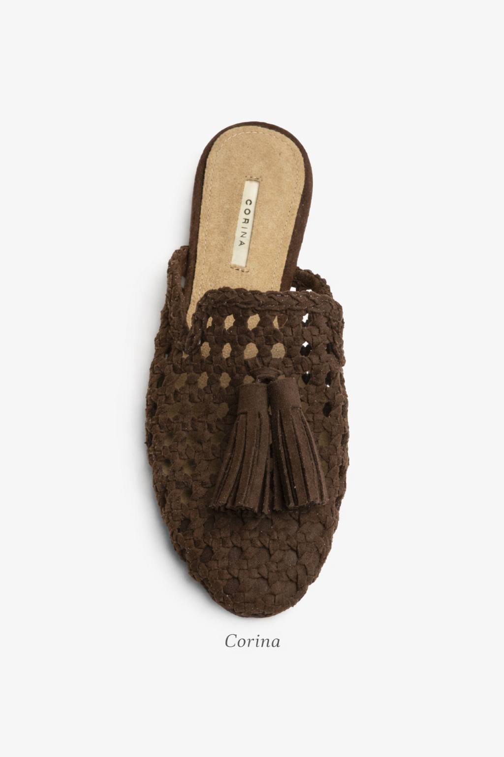 Mule em tom castanho chocolate com entrançado artesanal .