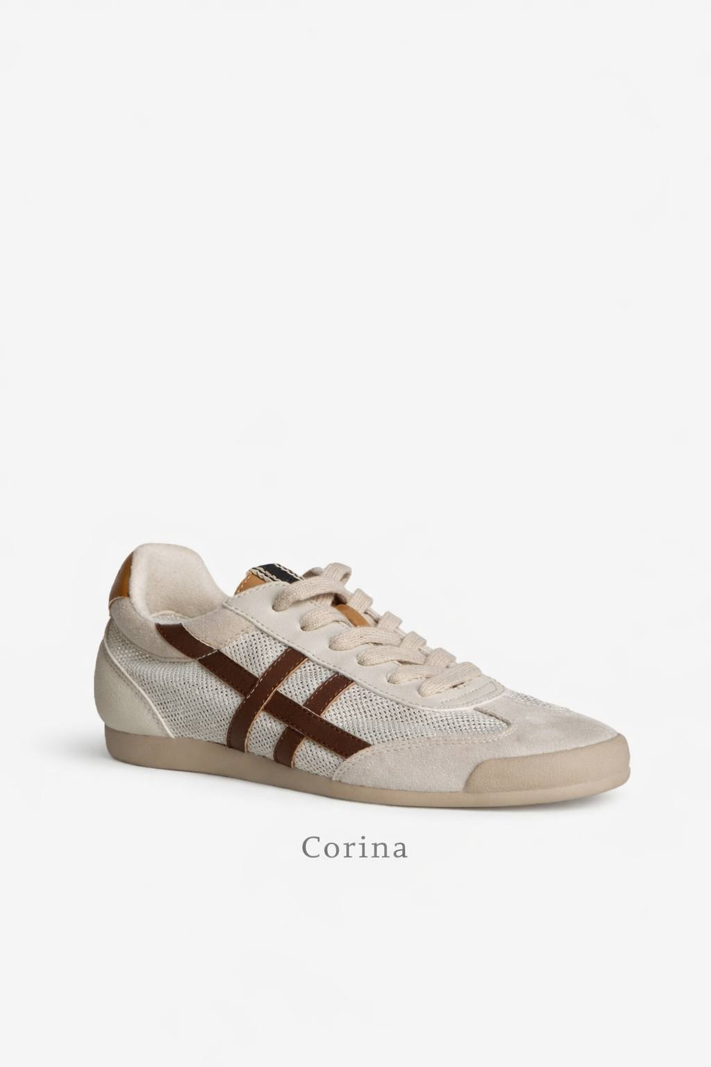 Ténis em combinação de bege e apontamentos em castanho — diferentes, leves e super confortáveis.